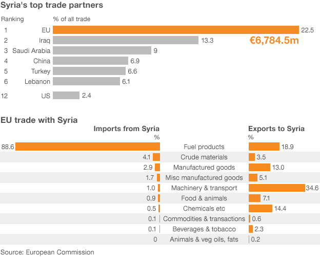 The actions in Houla certainly merit Security Council condemnation, but Baird’s ideas about « stronger diplomatic action » and « repercussions » and « strong measures » seem to boil down to economic sanctions. When it comes to economic sanctions, however, the biggest screws have already been turned. The EU, Syria’s largest trade partner (see chart below), along with the Arab League, have imposed comprehensive sanctions.