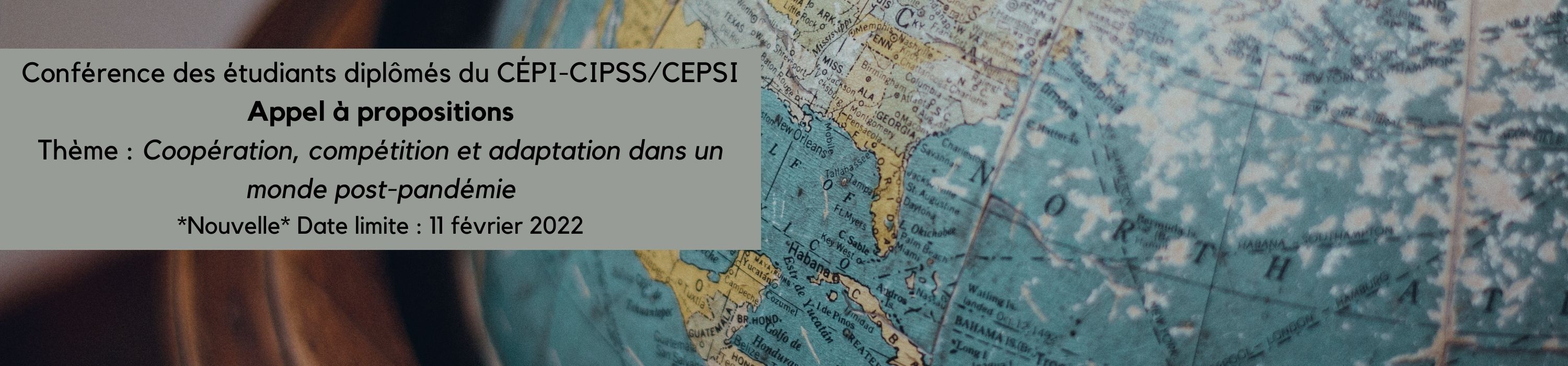 Le Centre d’études en politiques internationales est ravi d’annoncer une nouvelle édition de notre conférence annuelle des étudiants aux cycles supérieurs. Cette année, le thème de la conférence sera : « Coopération, compétition et adaptation dans un monde post-pandémie ». La conférence aura lieu le 18 mars 2022, à l’Université d’Ottawa. L’évènement se tiendra en personne et dans le respect des mesures de distanciation physique actuelles (la conférence sera virtuelle si les mesures de santé publique ne permettent pas les événements en présentiel). Le Centre d’études en politiques internationales (CÉPI) est heureux d’offrir un nombre limité de bourses de voyage aux étudiants d’autres universités canadiennes qui souhaitent participer à l’événement. Veuillez indiquer dans votre soumission si vous désirez être considéré pour une bourse de voyage. Cet événement est organisé en collaboration avec le Centre d’études sur la paix et la sécurité internationale de l’Université McGill et de l’Université de Montréal.